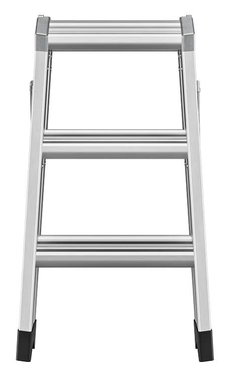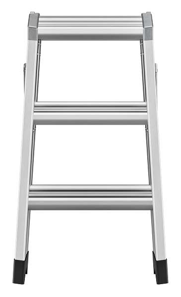 Lehký a stabilní hliníkový dvoustupňový žebřík s ergonomickými stupni a velkou plochou pro postavení.