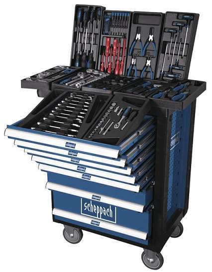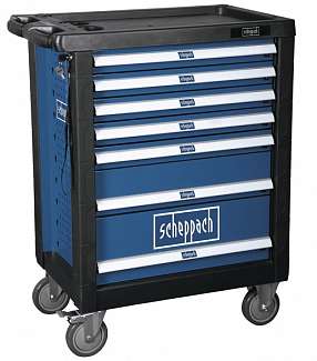 Scheppach TW 1000 je celokovový dílenský vozík vhodný do domácích i řemeslných dílen, garáží, servisů apod. Vyznačuje se velmi tuhou konstrukcí, opláštěním hran vozíku tvrzeným plastem, pracovní deskou z odolného plastu s prolisy pro uložení drobného materiálu a s nízkým ochranným lemem, který udrží vaše nářadí vždy na místě. Pro snadnou manipulaci s vozíkem slouží dvě transportní měkčená madla a čtyři velká kola. Ty jsou pogumovaná a dvě z nich jsou plně otočná s integrovanou brzdou. Špičkovou kvalitu poznáte i podle snadné manipulace se zásuvkami. Ty jsou vybaveny velmi robustními a kvalitními pojezdy, takže se s nimi snadno manipuluje i při plném zatížení. Samozřejmostí je mechanismus bránící jejich samovolnému otevření a rovněž zámek, který chrání obsah před přístupem nepovolaných osob. Boční stěny vozíku jsou vybaveny děrovanou deskou, na kterou lze navěsit další nářadí nebo vhodné držáky či poličky. Čtyři zásuvky jsou vybaveny kvalitním běžně používaným nářadím (gola sady, kleště, různé druhy šroubováků, kladiva, klíče, elektrikářské díly apod.), zbylé tři zásuvky si můžete dovybavit nářadím dle svých požadavků. Každý kus nářadí má přesně stanovené místo a bude tak vždy a rychle po ruce.